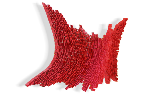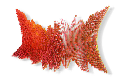 Esbozo una propuesta, donde el matiz rojo, similar al de un pétalo o un ala dan forma a una instalación de 200 cm aproximadamente en forma continua. en ese espacio los tres fragmentos que conforman la obra, a pesar de revelar la idea de separación, vienen a estructurar plenamente las alas de un ave, diseminada en sus partes. De la misma forma, los fragmentos conforman un todo semejante al universo que se nos muestra a partir de un orden inherente a la geometría, las líneas, los surcos y las forma simples y estilizadas que construye un todo que relaciona la vida con la libertad y la naturaleza basada en una gramática compuestas de ritmo, frecuencias y vibraciones ensambladas.